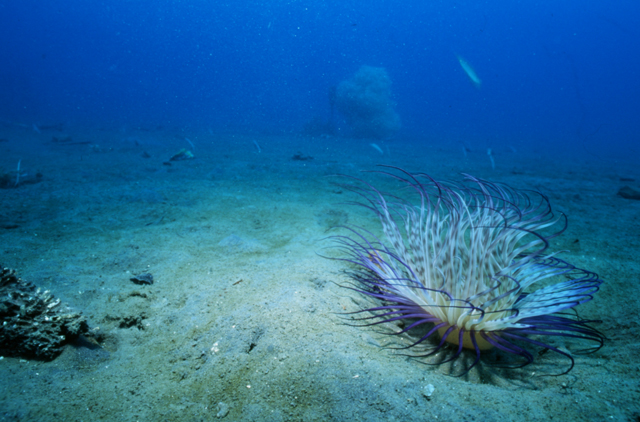 砂泥底の所々に、ムラサキハナギンチャクやスナイソギンチャクが点在している。 ダイビングを始める前は、このような生物の存在すら知らなかった。これは透明度が 非常に良い時に撮ったムラサキハナギンチャクである。流れにユラユラ揺れる姿は神 秘的である。水中写真をやっている人の中には、こればかり専門に撮っている方もい る。わかる気がする。