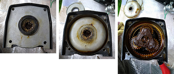 5.ネジ4本を外した本体側のカバー2枚を外すと中に遊星ギヤ(三つのギヤ)が
