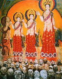 観音菩薩の慈愛 F100号 2000年作品 太陽に照らされた三人の菩薩が、500羅漢に慈愛の光で苦難を救う姿