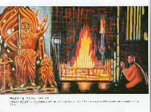 護摩を焚く姿 不動明王に寄り添う制多童子と矛羊葛童子に向かい諸々の願いを込めたお札を火中に投じ、護摩を焚く姿 M100