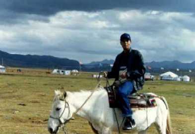 見学の後街の通りをぶらつきながらホテルに帰り昼食を済ませると,郊外の平原へ出かけて乗馬を楽しむ。 観光客用の乗馬コーナーが平原の一角にあり,蔵族(チベット族)のおばさんやその子どもたちが,一回21元で乗せてくれる。 先に1回1時間と聞いていたが,それはかなりいいかげんで,彼等は金儲けをしたいだけだから一刻でも早くおしまいにしたがる。 轡を取ってもらう身としては,気が弱いと,降りてくれとそれとなく言われると,妥協してしまいがちだ。 生きのいいアメリカ人の男の子などは勝手に単独で馬を駆って走り回っていた。 ひと走り,いやひと歩きのあとはテントでお青酒(ハトムギから作る20度くらいの酒)を賞味する。