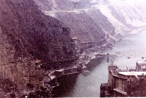 - 石門棧道 shimen zhandaoは漢中市街の真北約17kmにある。 当時そこへ通じる道路は改修中であった。 石門とは岩をくり貫いて造った隧道(トンネル)を意味する。 昔の工法は岩肌を火の熱であぶり,水を注いで,もろくなった岩片が崩れ落ちるのを利用するもの("減焚水激"というのだそうだ)。 棧道(さんどう)とは,古代,河川の急な崖などに沿って岩に横杭を打ち込み,橋桁を渡した木製の道を言う。 現在ここに再建されている棧道は太いコンクリートの橋杭に幅広い橋桁を渡しているので,二人並んでも歩けるが,昔の本物の棧道は一人が通れるだけの狭いものであったそうである。 すぐ上手には,褒江(漢江に注ぎ込む谷川)を堰きとめて造った石門水庫(石門ダム)があり,昔の棧道跡はダムから上手では水没している。