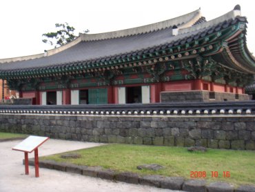 觀コ亭は1448年世宗大王の治世時に牧使(mogsa ,総督のこと)辛叔晴が兵士たちを訓練するために作った建物である。 建物自体は修復や建て替えが重ねられて,古くはない。 最後に手が加えられたのは2006年である。 建物前の広場の左右には本物の石神トルハルバン