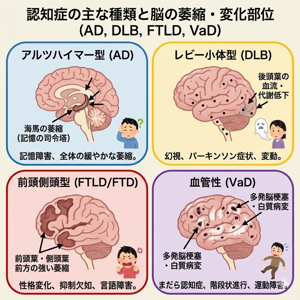 アルツハイマー型認知症 (AD): 最も多いタイプ。脳が少しずつ萎縮し、新しいことが覚えられなくなります。