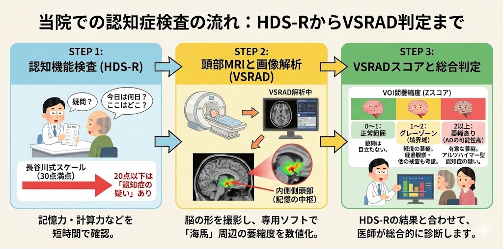 【当院での診断:MRIと記憶力テスト】 認知症の診断、特にタイプの見極めには専門的な検査が必要です。