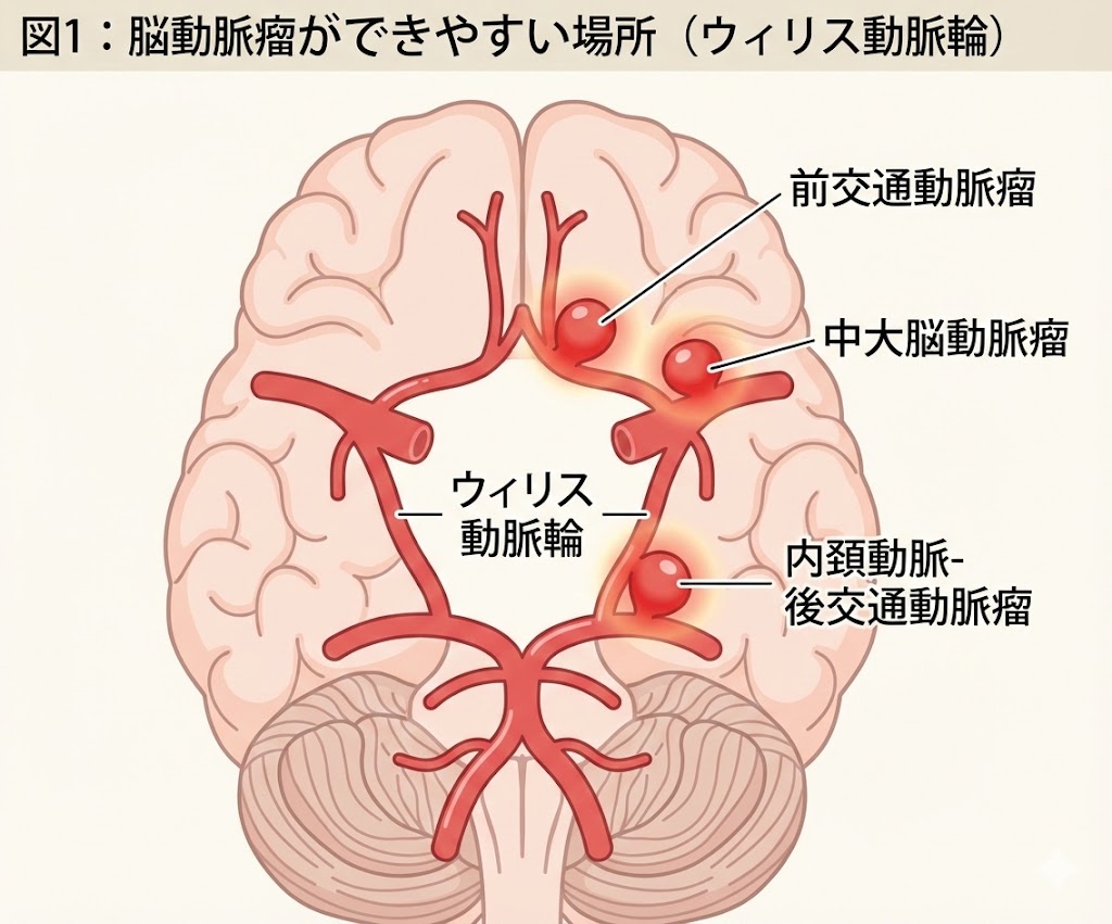 脳の底面には、左右の血管がリング状につながった「ウィリス動脈輪」という重要な血管のネットワークがあります。動脈瘤は、このリングの分岐点に好発します。