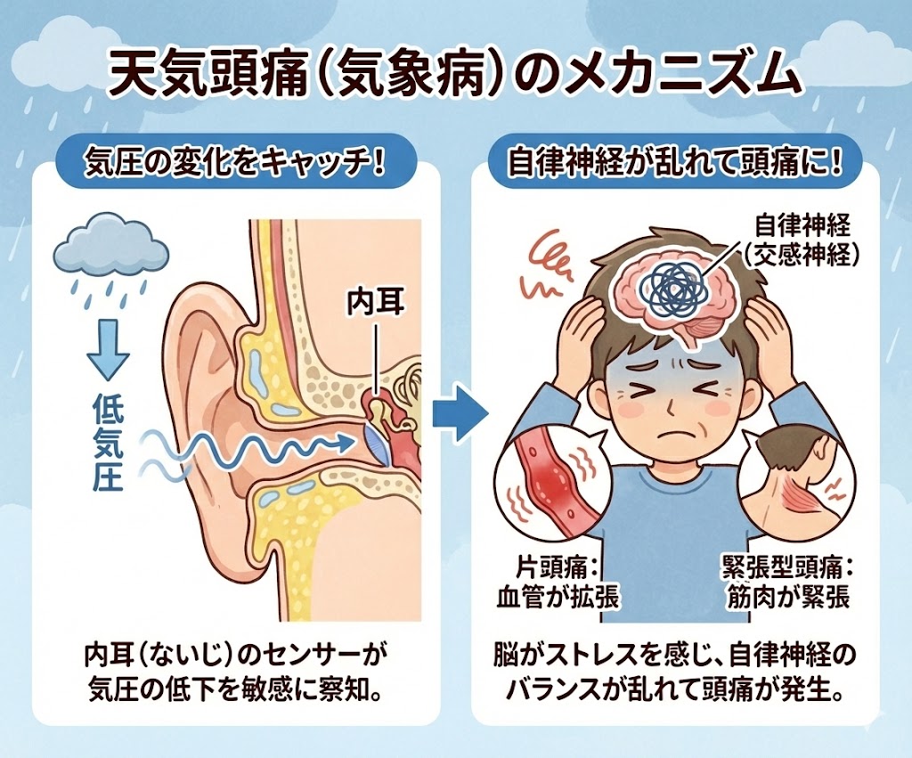 特に乗り物酔いしやすい人や、耳が敏感な人は、内耳のセンサーが過敏に反応しやすく、天気頭痛が起こりやすい傾向にあります。