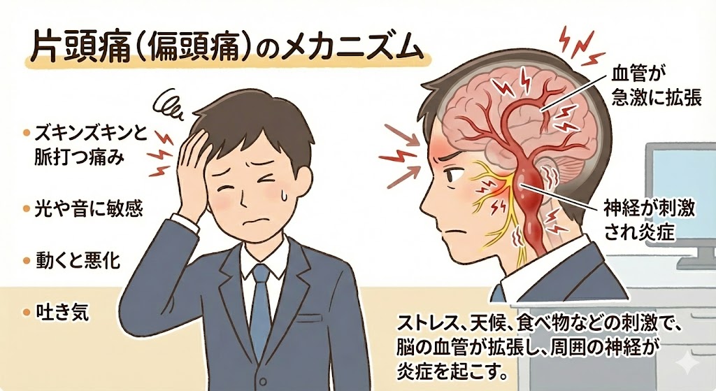 頭の片側(両側の場合もある)が、心臓の拍動に合わせてズキンズキンと脈打つような強い痛み。