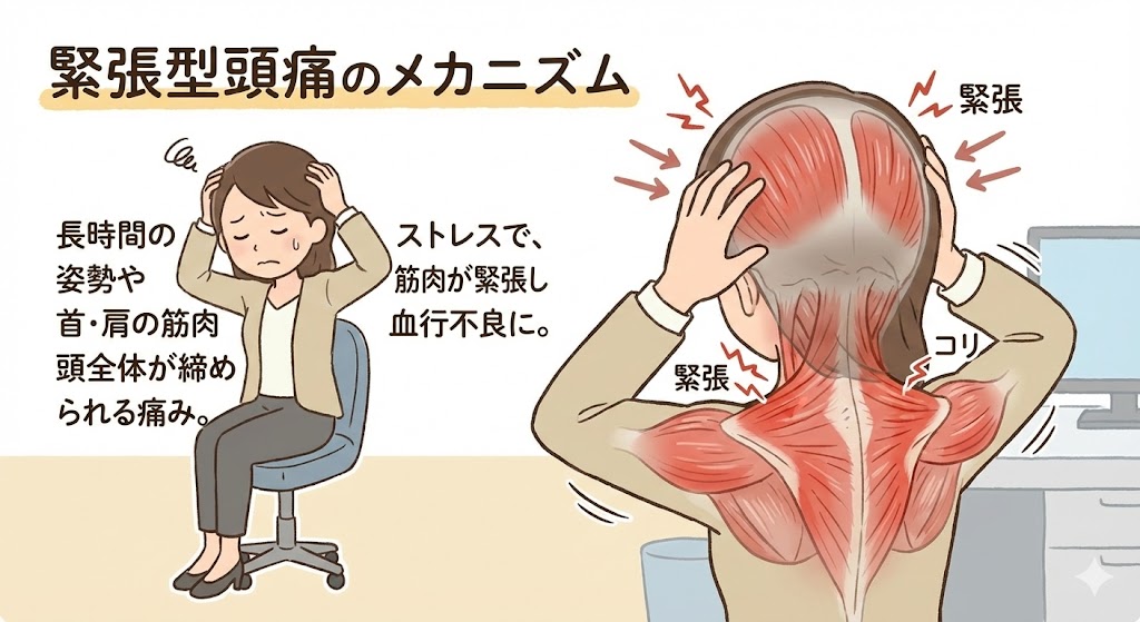 首や肩の筋肉が緊張し、血行が悪くなることで起こる頭痛です。ストレスや姿勢の悪さが主な原因です。