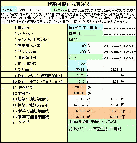 下記は、私の作った新築可能建物面積算定表です。自動で新築可能建物面積を概算してもらえます。