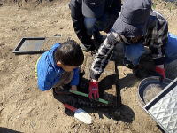 | 活動内容 | 落葉堆肥づくり・春キャベツ苗の間引き・冬の生物観察会 冬の生物観察では、今年は連年と比較して半月程度早く、ニホンアカガエルの卵塊を13個体を確認しました。 |
