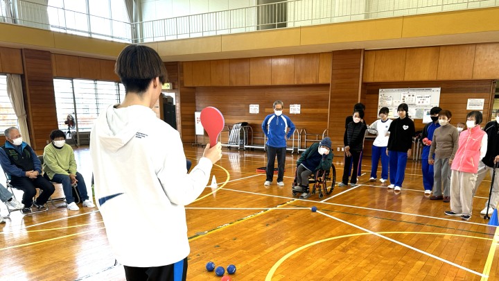 | 10 | 22 | フライングディスク交流会 ・会場 県総合福祉会館6階体育館 ・参加者 28人 大学生10人 ・内容 ボッチャゲーム・フライングディスクゲーム |