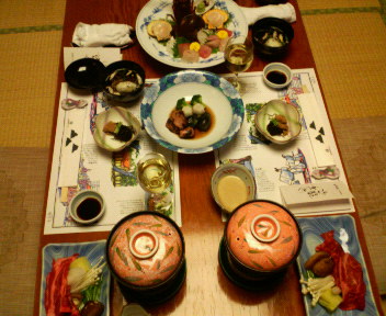 | さてさて宿泊先の潮路亭に到着。 待っていました夕食の時間。 伊勢海老のお刺身を含め、いろんな料理が テーブルいっぱい。 写真の料理は最初の状態。 このあとバンバン料理が運ばれてきてお腹 いっぱいになりました。 満足満足!! |